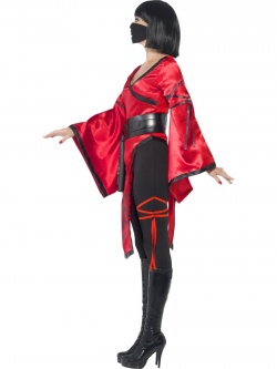 Kostým obsahuje červené šaty v japonském stylu s černými lemy a ornamenty, pásek, roušku na obličej, legíny a nunčaky.