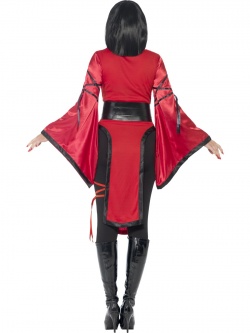 Kostým obsahuje červené šaty v japonském stylu s černými lemy a ornamenty, pásek, roušku na obličej, legíny a nunčaky.